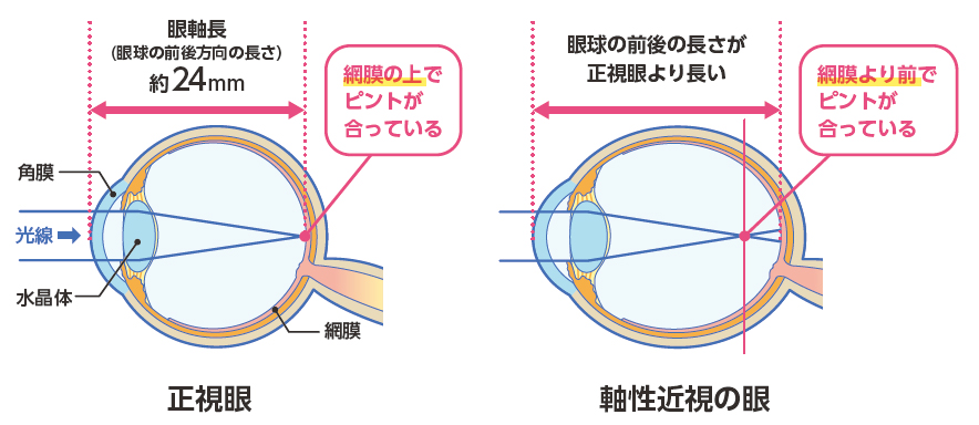 近視とは、目の中に入った光のピントが合う位置が網膜より前になっている状態のことをいいます。近視のほとんどは眼球が前後に伸びることで起こります。