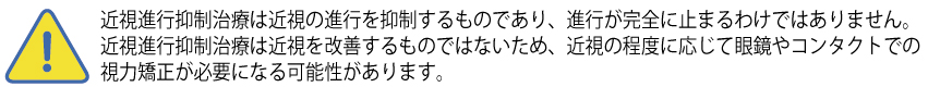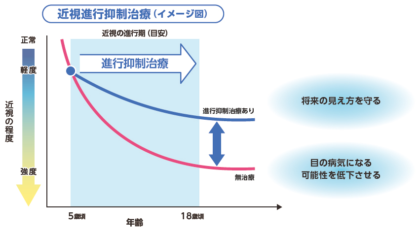 近視は子どものときほど速く進む可能性があります。早い段階からできるだけ近視が強くなるのを避けることで、将来の見え方を守り、目の病気になる可能性を低下させることが治療の目的です。